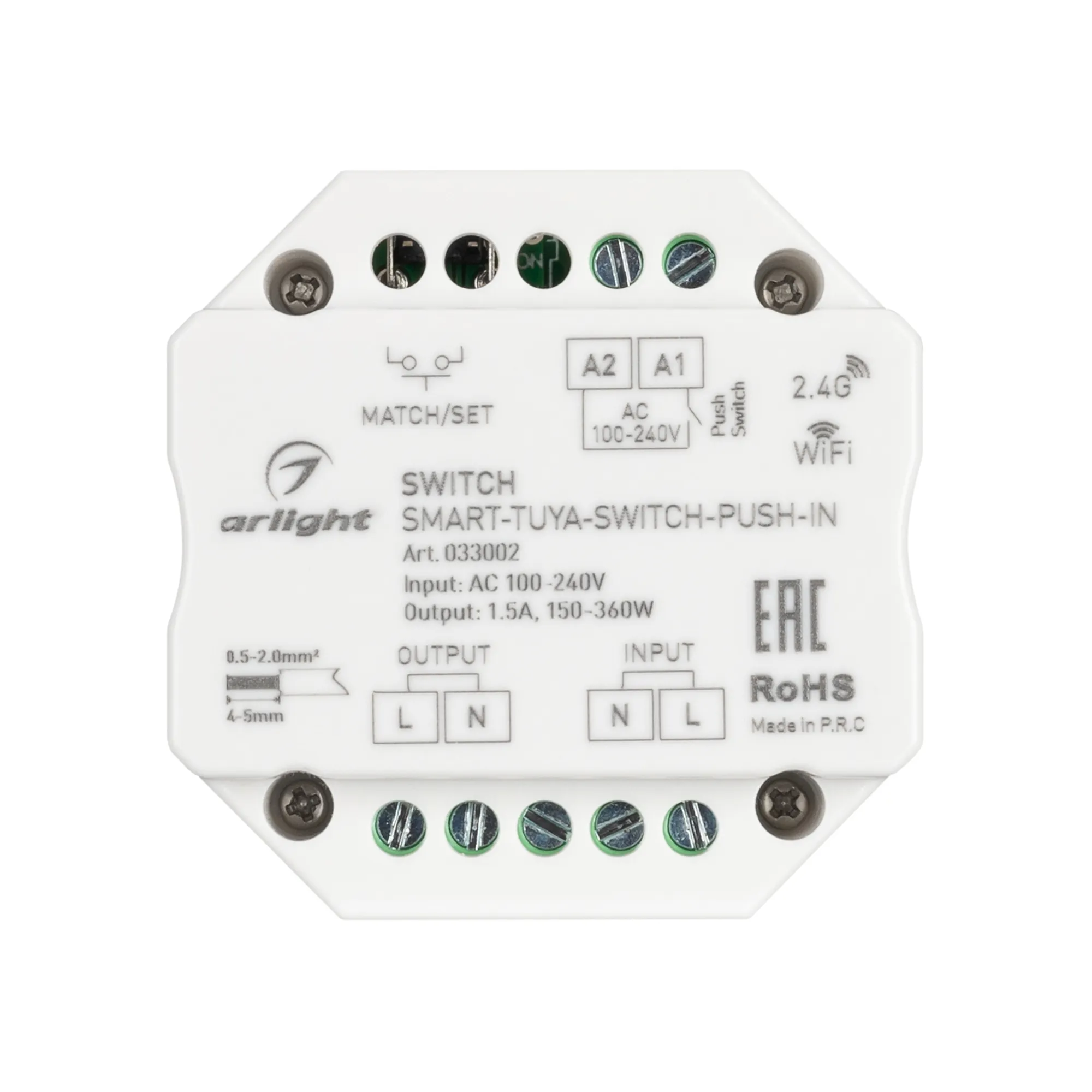 Выключатель для любых видов нагрузки AC 230V. Напряжение питания AC 100-240V, максимальный ток нагрузки 1.5А. Управление 2.4G+WiFi, интерфейс Tuya, поддерживается управление ЯНДЕКС АЛИСА, совместим с приложением INTELLIGENT ARLIGHT. Мощность указана для одиночных нагрузок (см. даташит). Поддерживает функцию Push-Switch. Габариты 52x52x26 мм. Совместим с пультами и панелями SMART. Заменяется на 046074.