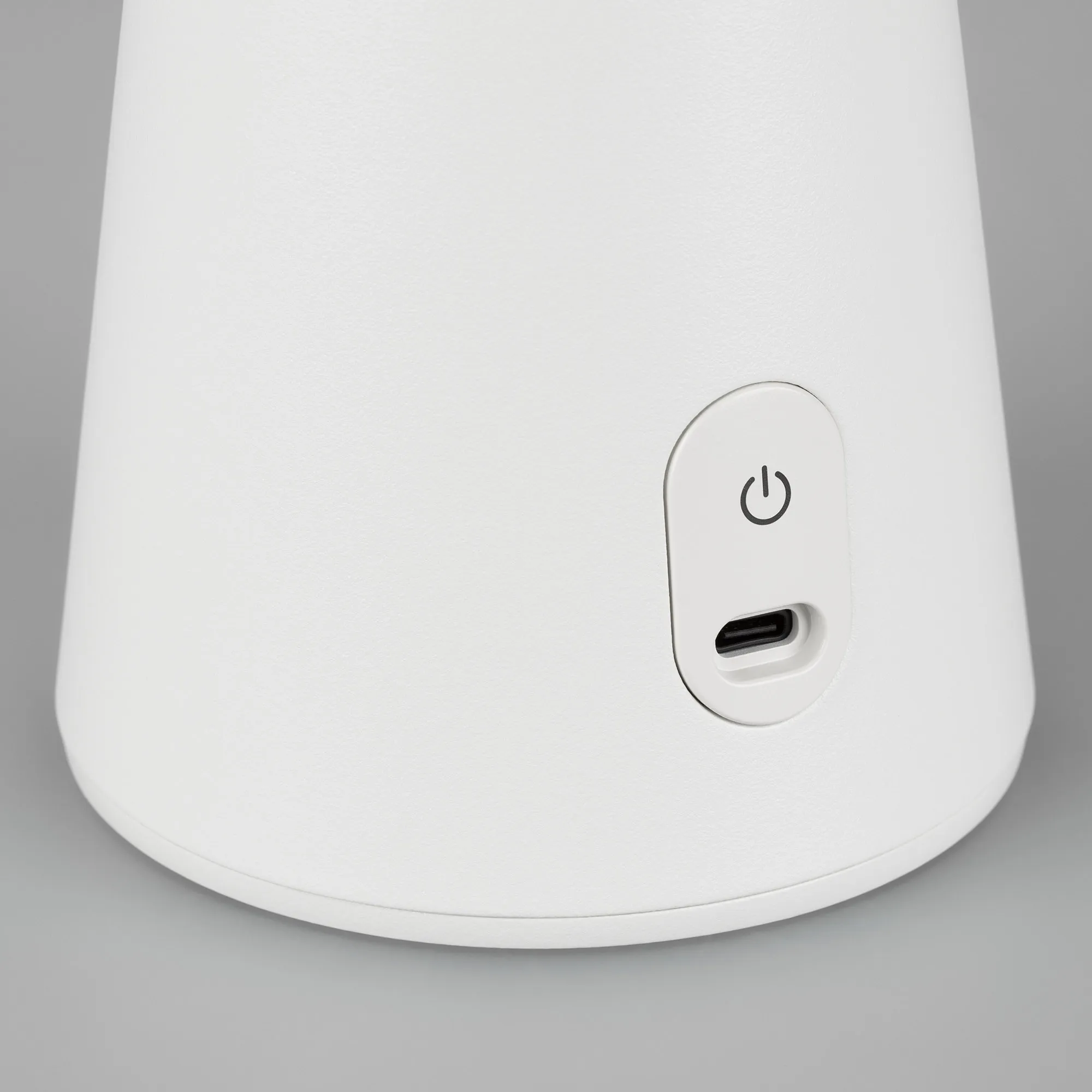 Настольный светильник со встроенным аккумулятором 2Вт, белый алюминиевый корпус. Цвет ТЕПЛЫЙ БЕЛЫЙ 3000K, св.поток 260лм, CRI(Ra)>80, угол 127°. Размер Ф197x292мм. IP54. Зарядка от сети переменного тока AC220-240V. Тип встроенного аккумулятора 4400мАч Li-ion, напряжение батареи 3.7V