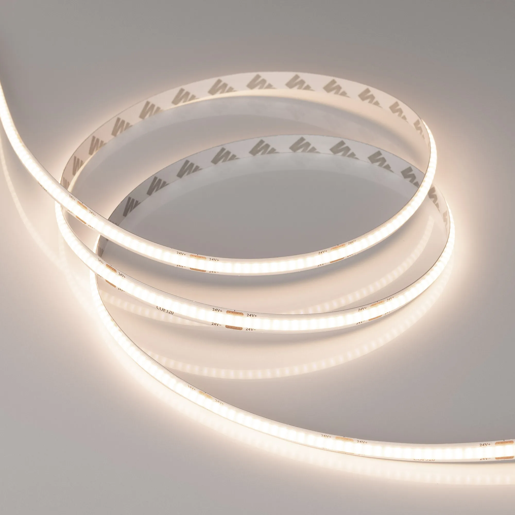 Светодиодная лента сплошного свечения COB серии X320. Светодиоды CSP, 320 шт/м, белая плата шириной 8 мм, скотч 3M. Цвет ТЕПЛЫЙ 3500K, индекс цветопередачи CRI>90, угол 175°. Питание 24 В, мощность 8 Вт/м (40 Вт на 5 м). Размеры 5000х8х2 мм. Мин. отрезок 50 мм. Цена за 1 м.