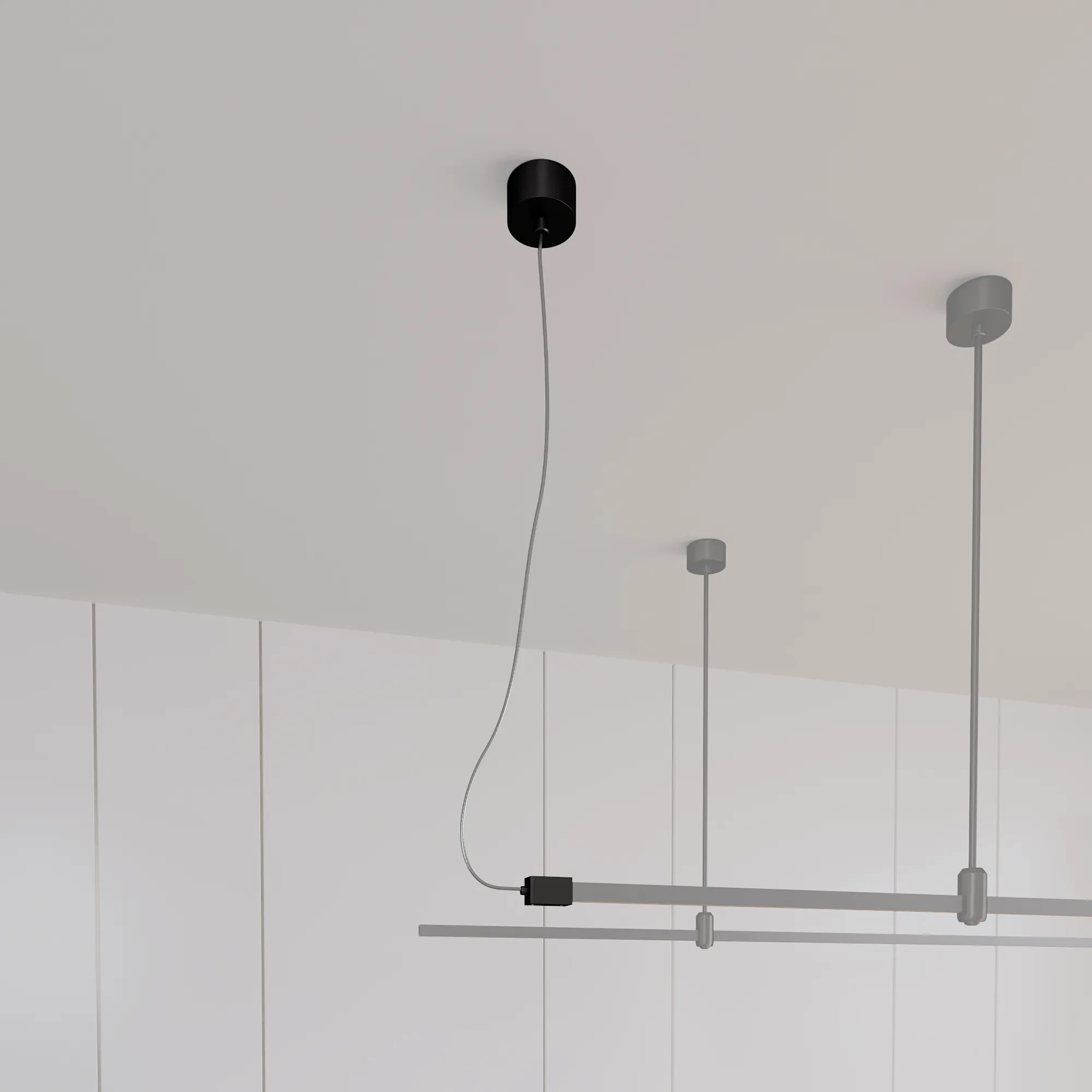 Потолочная чаша с боковым подводом питания треков системы APRIORI. Напряжение питания DC48V. Диаметр чаши 80 мм, внутренний диаметр чаши 74 мм, внешняя высота чаши 38 мм, глубина чаши до монтажного отверстия 25 мм, общая высота подвеса 5000 мм. Материал алюминий, цвет чёрный.