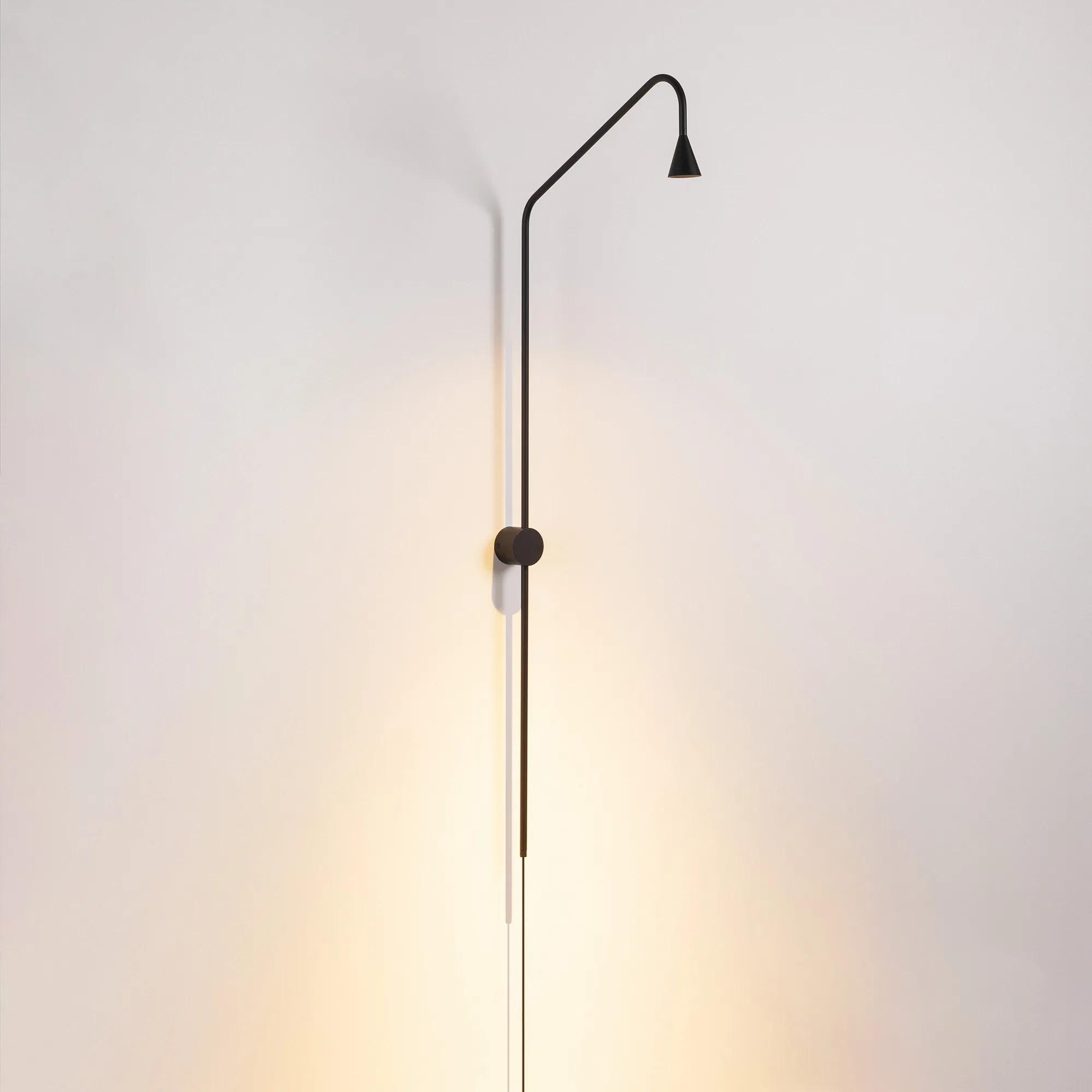 Декоративный настенный светильник. Мощность 5 Вт, св. поток 420 лм, 84 лм/Вт, теплый 3000К, CRI>94, угол 36°, напряжение питания 230 В. Черный корпус из алюминия, степень защиты IP20.Размер настенного крепления 69,5х70мм, диаметр штанги Ø11,4, высота светильника 1200 мм, длина держателя светоизлучателя 420 мм, размер светоизлучателя Ø50×56 мм. Длина провода до выключателя 500 мм, от выключателя к розетке 1500 мм, питание от сети 220-240V. Драйвер 12 В, 750 мА, пульсация <1%.